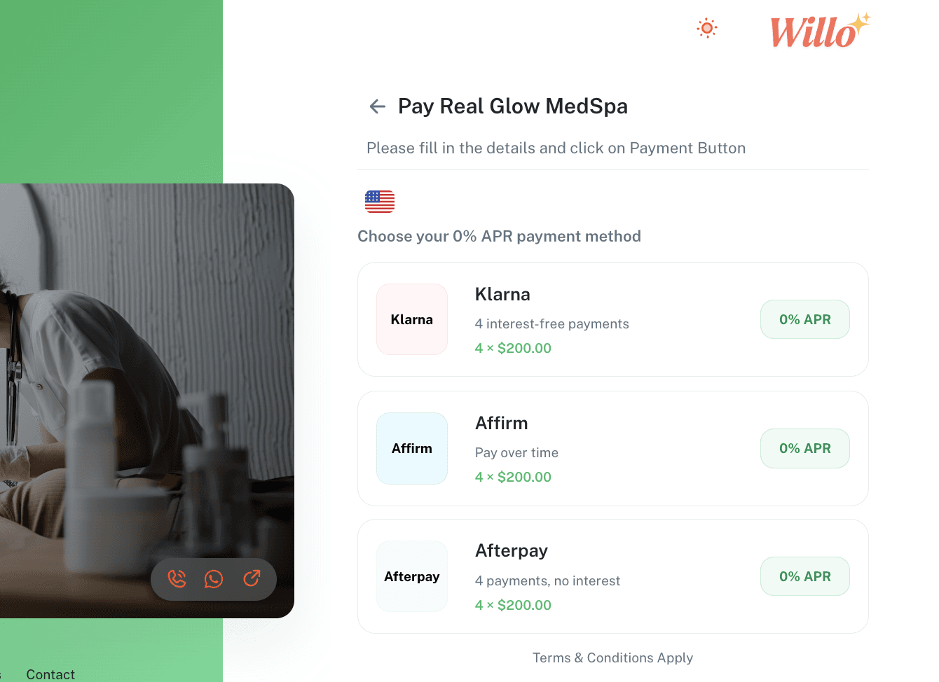 "Emily Johnson – $1,800 Botox + Lip Filler – wants pay-later options". AI Agent generates a single smart checkout link. The patient doesn’t have to know each brand—they just see clear options on one screen.